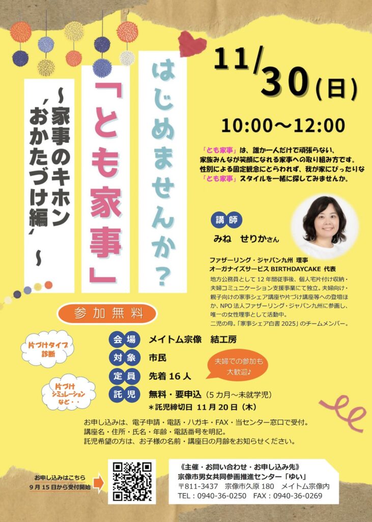 【登壇情報】はじめませんか?「とも家事」~家事のキホン‘おかたづけ編’~(宗像市) 2025年10月13日 セミナー, 新着情報, ブログ 福岡県宗像市にて開催される「はじめませんか?「とも家事」~家事のキホン‘おかたづけ編’~」に、みねが講師として登壇いたします。 詳細・お申し込みは、ファザーリング・ジャパン九州のHPよりご確認ください。 https://fjq.jp/event/20251130/